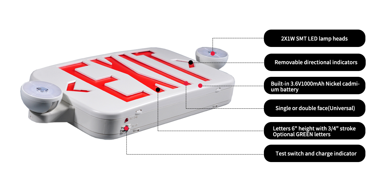 Een efficiënte en veilige exit -teken / noodlichtcombinatie. Bespaar geld om dit 2-in-1 product te kopen. Langdurige, onderhoudsarme NI-CAD-batterij. Werkt op 120 - 277 Vac Universal Spanning. FacePlate bevat knock-out pijlen links/rechts. Armatuur is 1 of 2zijdig. Product wordt UL vermeld en voldoet aan NFPA 101, OSHA en UL 924 noodcodes. Als huis, commerciële en industriële verlichting, perfect voor gang, gang, ziekenhuis, appartementen, kerken, winkelcentra, supermarkten, scholen, hotel, pub, restaurant, pakhuizen, kantoorgebouw, enz.