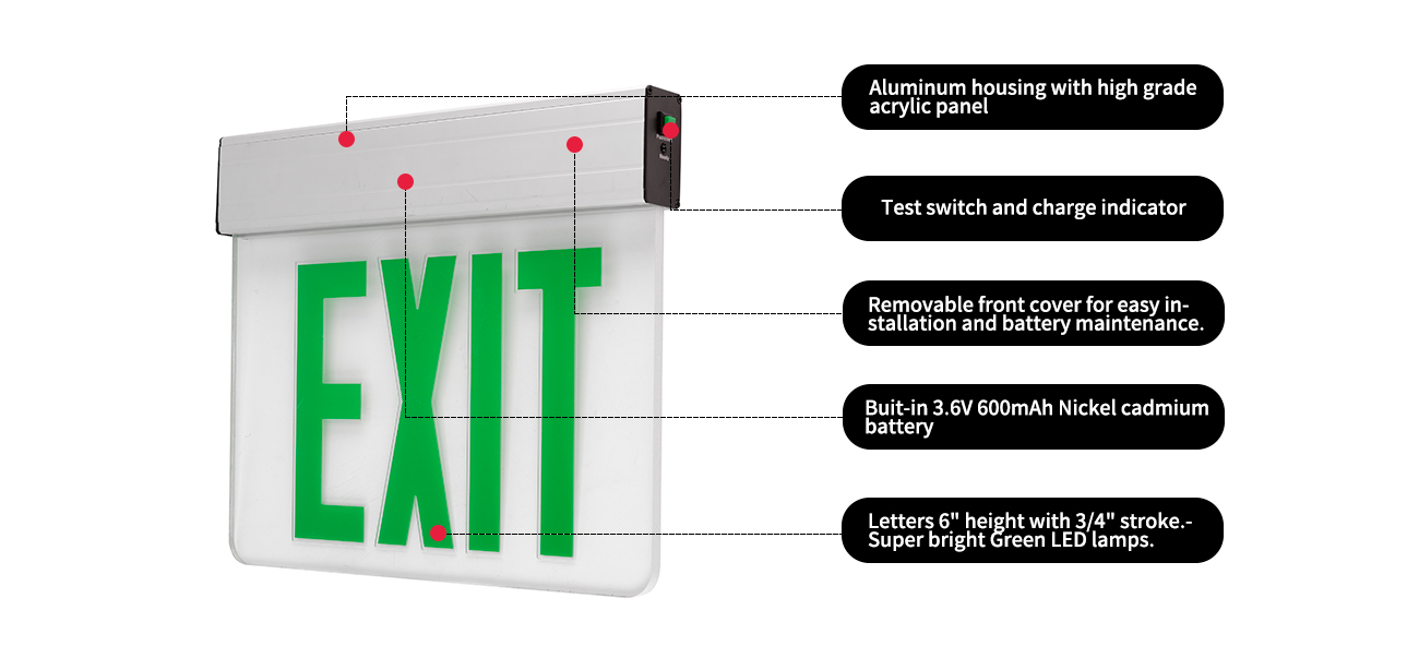 *Constructie - Deze rand verlichte exit tekenbehuizing is gebouwd van gegoten aluminiumhuizingen met een geëtst, helder acrylpaneel. Lettering is 6 "hoog met 3/4" slag. Aluminium behuizing is standaard, zwart -witte behuizing beschikbaar.