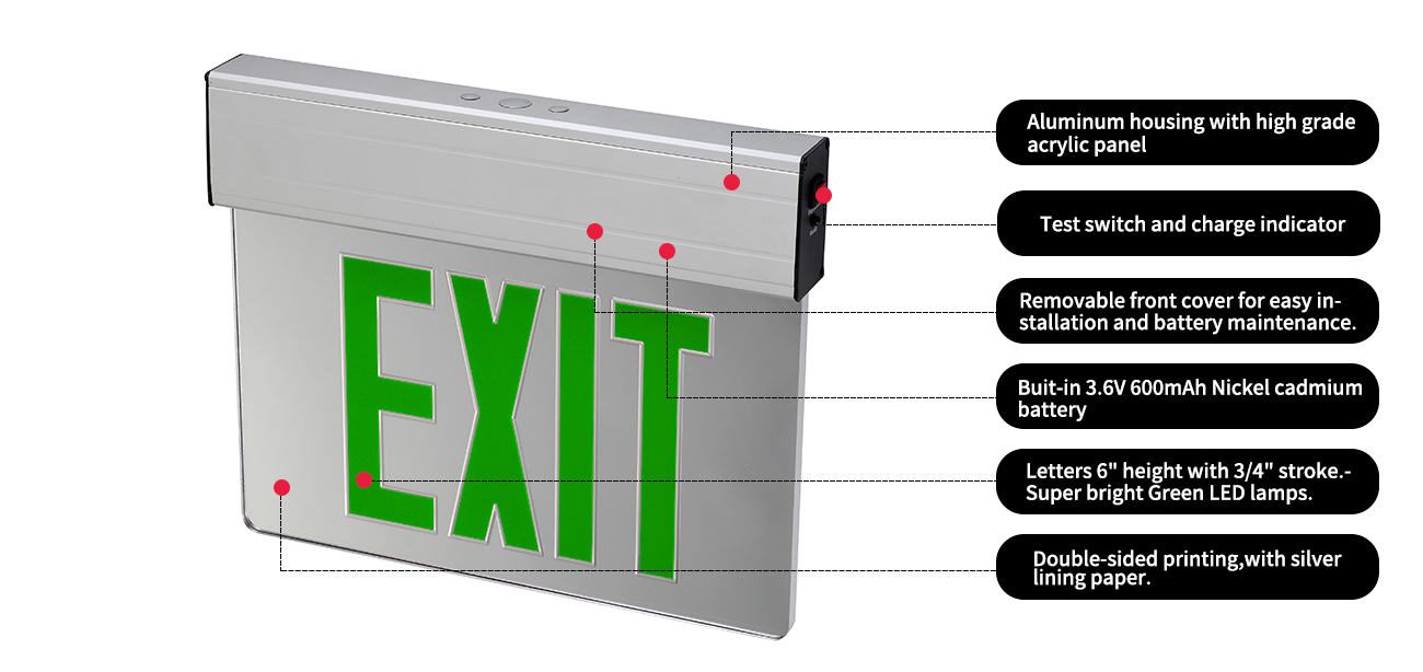 Het ultieme exit -teken in ontwerp en veelzijdigheid. Dit groene LED -rand verlichte exit -bord zal bijna elk montageprobleem oplossen.  Deze ene stijl zorgt voor plafond-, zijkant- en wandmontage -installatie.  Het Edge Lit-paneel is gebouwd van hoogwaardige acryl met aanpasbare directionele pijlen om naar de uitgangsrichting te wijzen. De afneembare voorklep maakt installatie- en onderhoudshoofdpijnvrij!