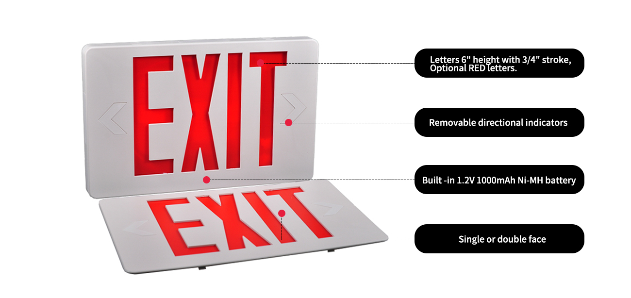 *Verlichting - De verlichting van de LED -exit -tekenreeks wordt bereikt door het gebruik van langdurige, efficiënte ultrahellige rode LED's. Kleurafhankelijke diffuser elimineert hots-vlekken en strepen, waardoor optimale lichtuitgang biedt.